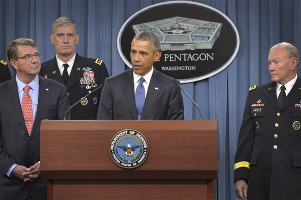 Pentagon, July 6, 2015: Barack Obama (center), Defense Secretary Ash Carter (left), Chairman of Joint Chiefs of Staff Army Gen. Martin E. Dempsey (right) (–DoD/Glenn Fawcett)