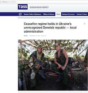 The non-recognition is emphasized here by TASS, the Russian state agency, so it is the Russian government itself that wants the reader to have on his mind imprinted first and foremost the idea of non-recognition, but without mentioning the fact that it is the Russian government itself which refuses to recognize the DPR and the LPR or officially even their national liberation struggle as such. Second, TASS and, behind TASS, the Russian government emphasizes that the DPR and the LPR are really “Ukraine’s.” Here it does not just mean any Ukraine’s in general, but today’s Ukraine’s which happens to be ruled by the Banderite fascist oligarchs.
