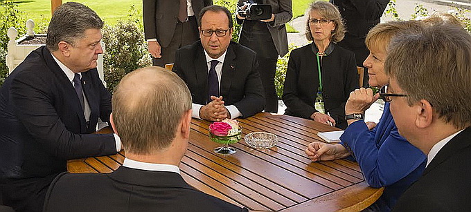 Poroshenko, Putin (back), Hollande, Merkel (2nd right), at the Normandy Four meeting in Paris, October 2015