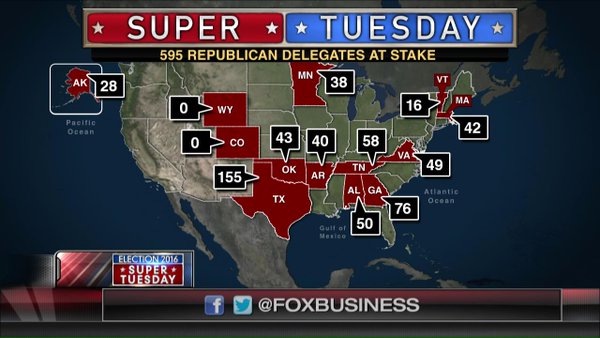 Billionaire business mogul Donald Trump is positioned to win most of the Republican primary and caucus events scheduled for Super Tuesday, March 1, 2016, when some 600 delegates will be assigned, or more than one quarter of the total in the Republican race. Recent polls show Trump with a substantial lead in Alabama, Georgia, Massachusetts, Oklahoma, Tennessee, Vermont, and Virginia. Cruz tops the polls in Arkansas and Texas, while Rubio is ahead in Minnesota.