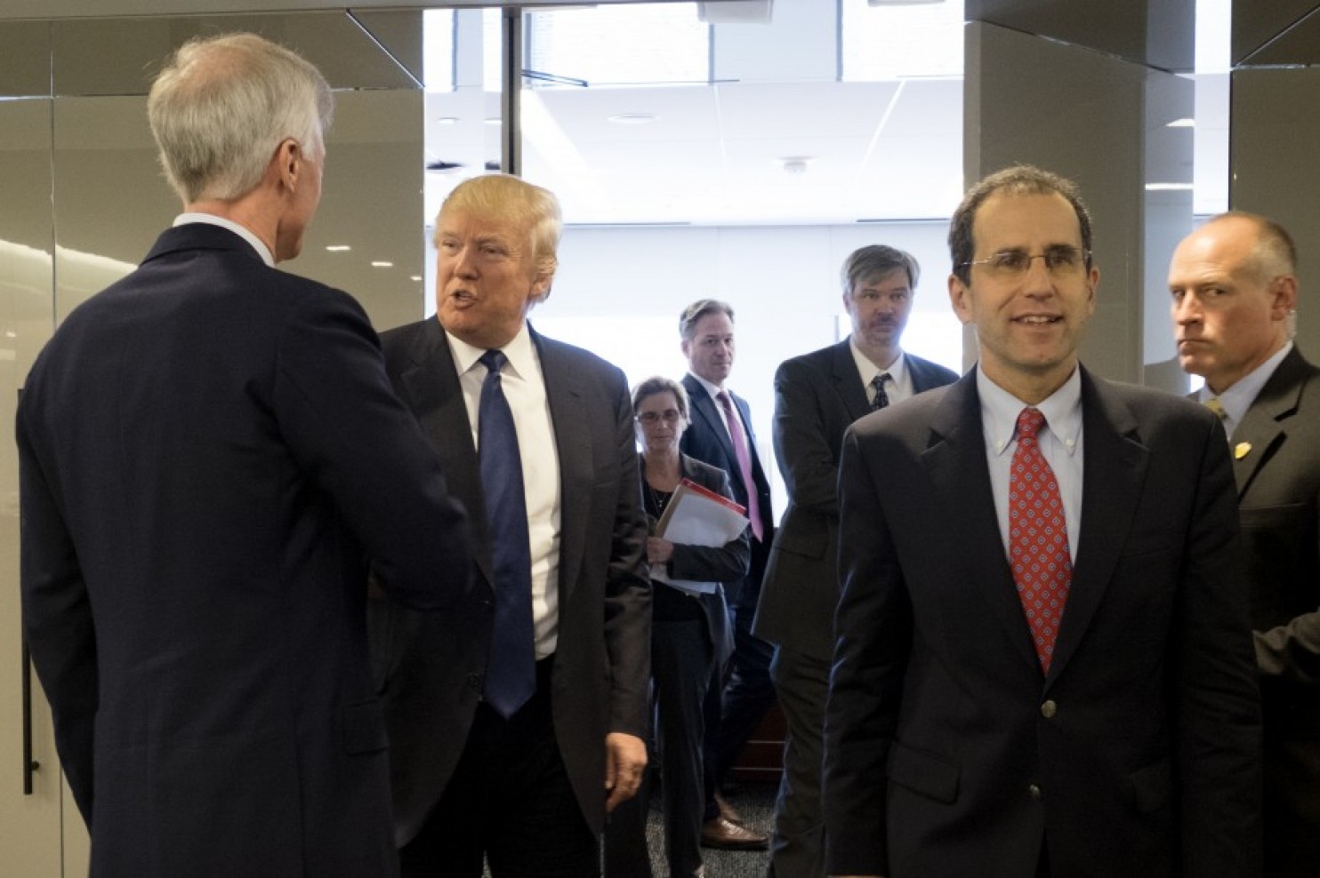 Donald Trump speaks with Washington Post Publisher Fred Ryan, left, as he departs a meeting with the editorial board of The Washington Post. Editorial page editor Fred Hiatt is on the right. (–Bonnie Jo Mount/Washington Post)