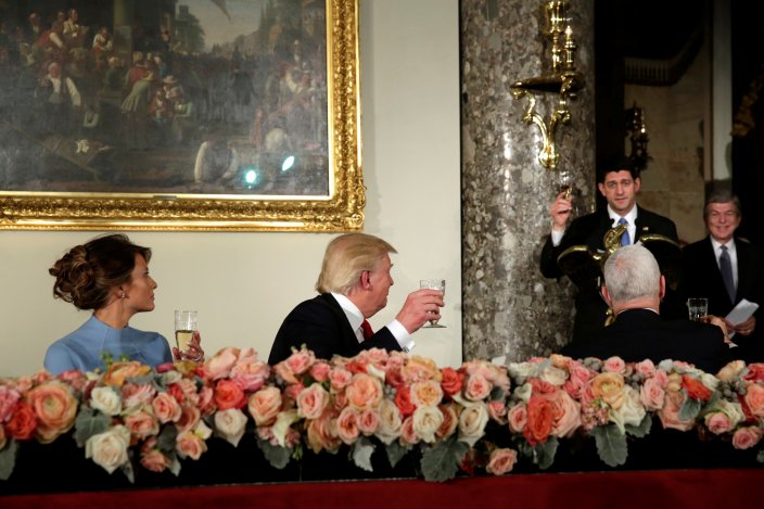 The scene cut back to Capitol and the ceremonial luncheon. Trump and his elegant entourage entered the luncheon room, and our newly inaugurated President gave a very short speech expressing thanks. There followed a belabored talk by the host of the event, through which Trump looked bored and resigned, while Melania remained expressionless and regal. The host meanwhile illuminated us on the origins of some of the many statues and paintings in the room, letting us know that the newly added statue of Rosa Parks showed her sitting down rather than standing up like all the other statues, which posture the host found touching and meaningful.