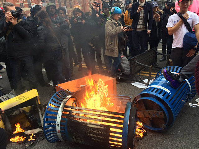 The scene cut again to another street where perhaps 30 protesters had set a trashcan on fire. One guy suavely lit a cigarette from the fire, while another warmed his hands over it. One person threw on an American flag just for jollies, completing the pathetic scene. Then nearby, a journalist’s voice was heard yelling at the cameraman, “This isn’t where the news is happening! This is just a trashcan on fire!”