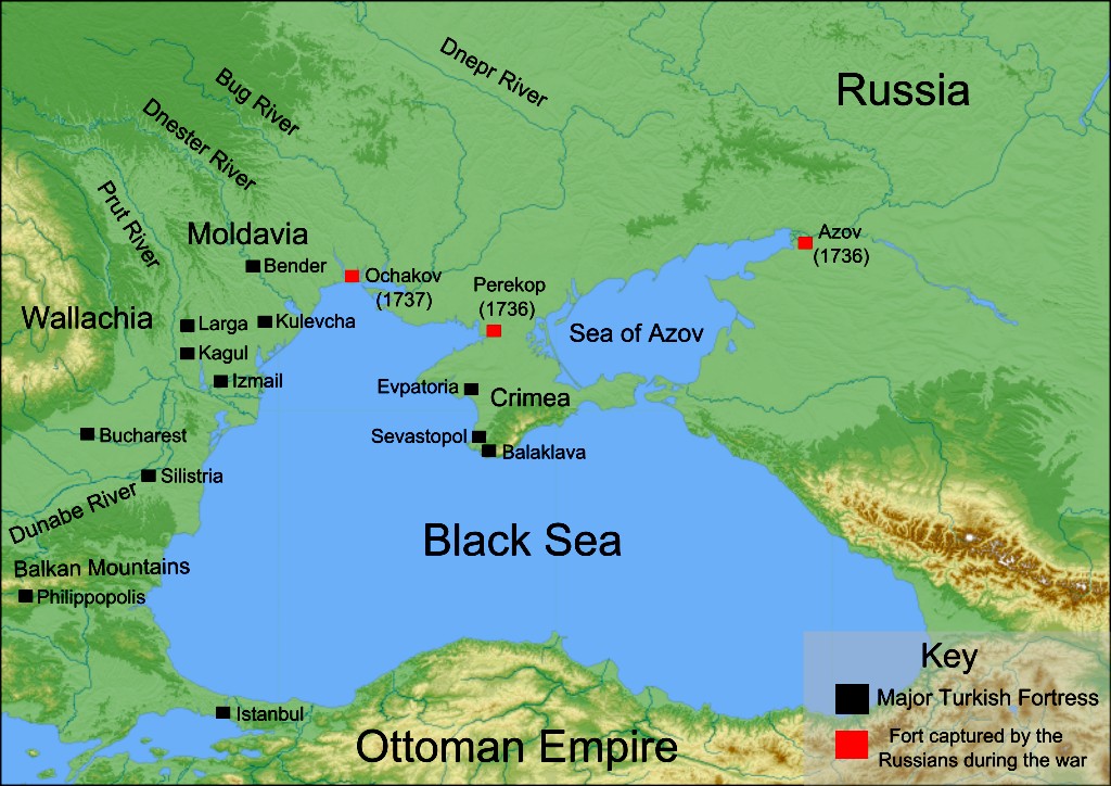 Click to enlarge. Ochakov (site of US base) left of center, Crimea center. Historic map: Russo-Turkish War of 1735-1739 (–Wikimedia.org)