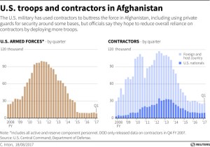 First, was this NGO sponsored by the CIA, or was it local? If the latter, Dasgupta may have a point. But that was in 2009, when American GI’s numbered about 32,000 (see chart above) and private American contractors about 7,000. The conversation occurred right before the Obama troop surge of 2010-2011, in which the total jumped to some 115,000. The numbers today are roughly 10,000 in each category, lower than 2009. Would Dasgupta want additional troops now after witnessing the destruction of Obama’s surge?